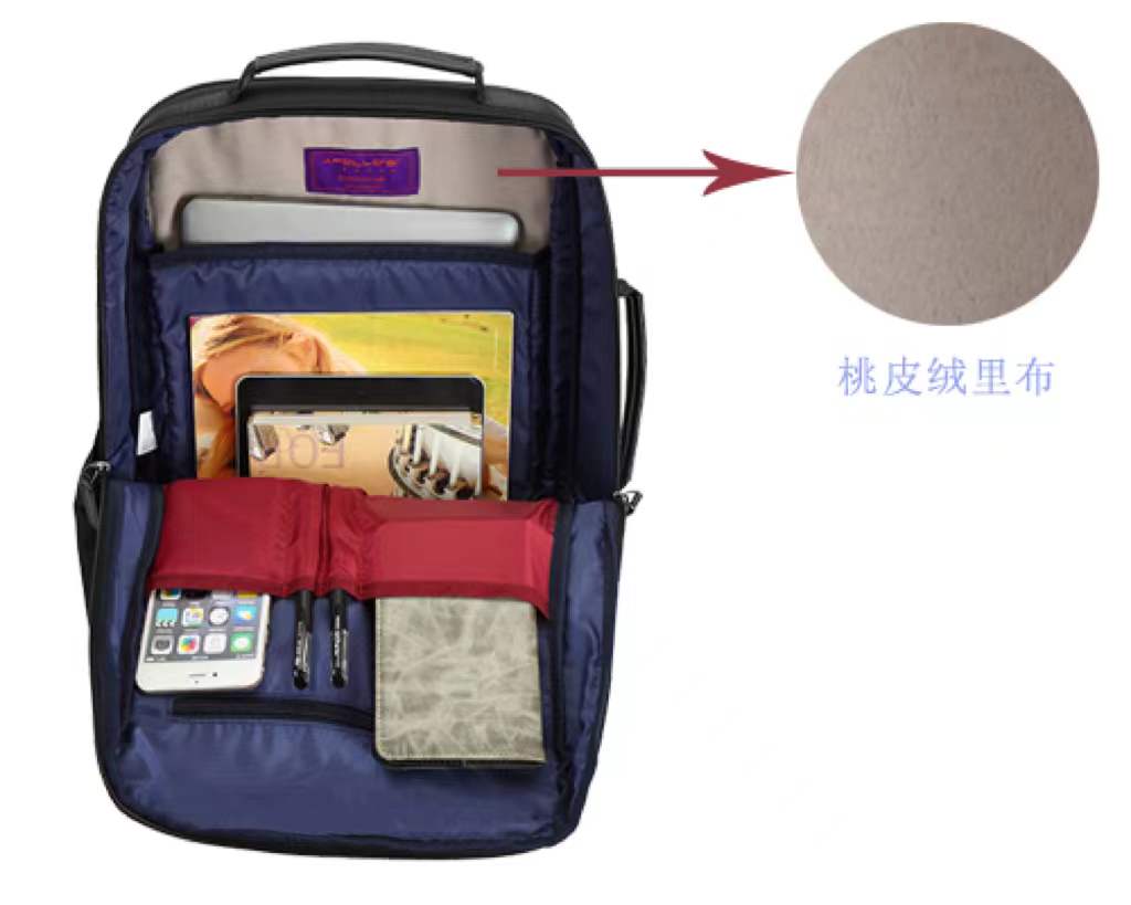 桃皮絨因其絨更短,表面幾乎看不出絨毛而皮膚卻能感知,以至手感和外觀更細膩而別致。具有吸濕、透氣、防水的功能以及蠶絲般的外觀和風格,織物柔軟,富有光澤,手感滑糯的特性。在背包定制時,正是因其材料特性,桃皮絨多數時候是用來作為背包里布使用,比如說一些內膽包、電腦背包等對背包內里材料要求比較高的包類產品,就會經常使用桃皮絨面料作為里布使用。